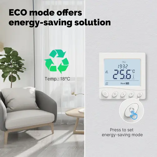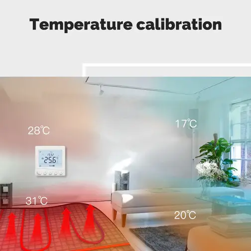 - واجهة عرض واضحة: شاشة تعرض درجة حرارة الغرفة ودرجة التدفئة، مع تصميم يجمع بين العرض والأزرار لسهولة الاستخدام.