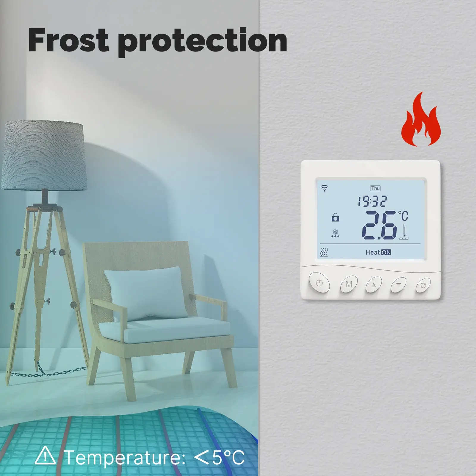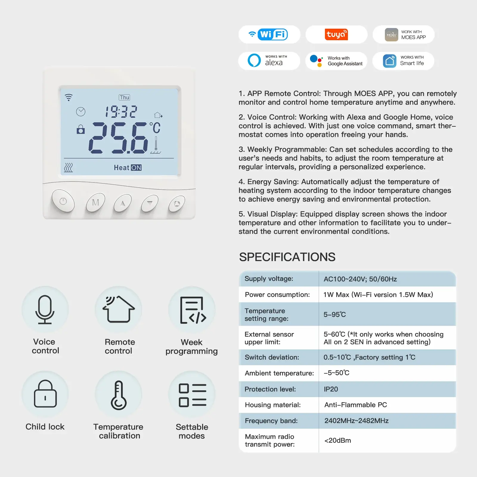يتميز ثرموستات MOES الذكي لتدفئة الأرضية عبر الواي فاي بمقبض تحكم، حيث يمكن للمستخدمين بسهولة ضبط الطاقة ودرجة الحرارة والوضع وإعدادات الواي فاي والإضاءة الخلفية ووظيفة المؤقت ونوع المستشعر. كما يوفر أيضًا ميزة معايرة درجة الحرارة والحماية من درجات الحرارة المرتفعة. إحدى الميزات الرئيسية لهذا الثرموستات هي قدرته على التوقف تلقائيًا عن التسخين عند وصول درجة الحرارة إلى القيمة المحددة للحماية. هذا الثرموستات الذكي يدعم أنظمة متعددة، إلى جانب التحكم الصوتي لراحة أكبر. تصميمه الموثوق يضمن قراءات دقيقة مع واجهة سهلة الاستخدام. يمكن للمستخدمين أيضًا مشاركة التحكم بالجهاز والتحكم به عن بُعد من خلال الاتصال اللاسلكي.