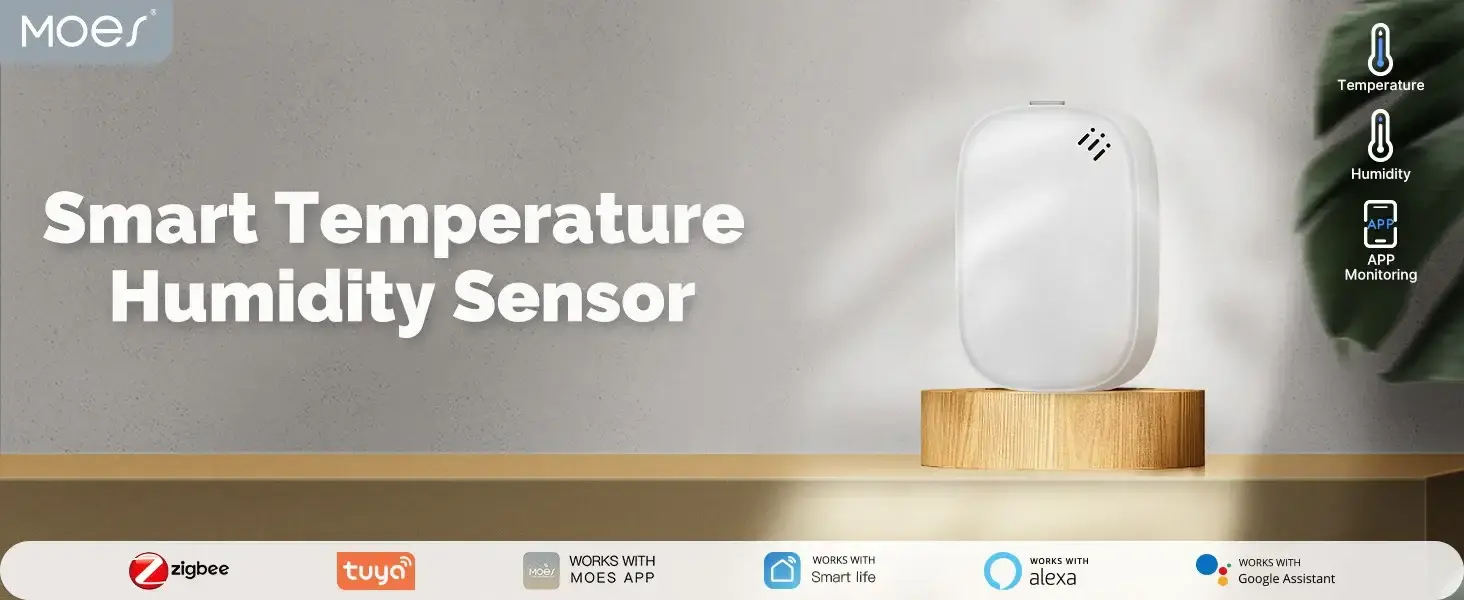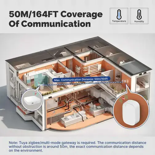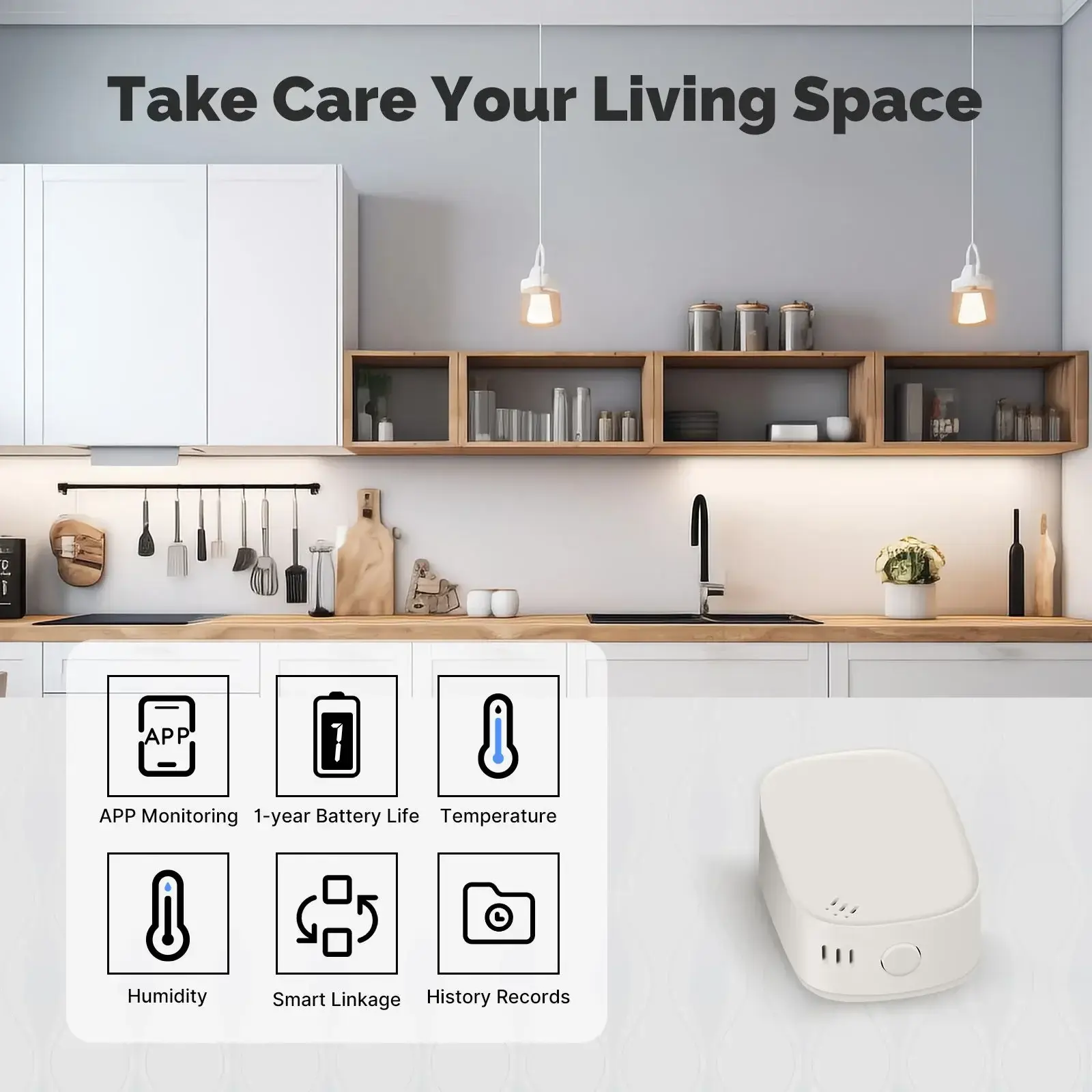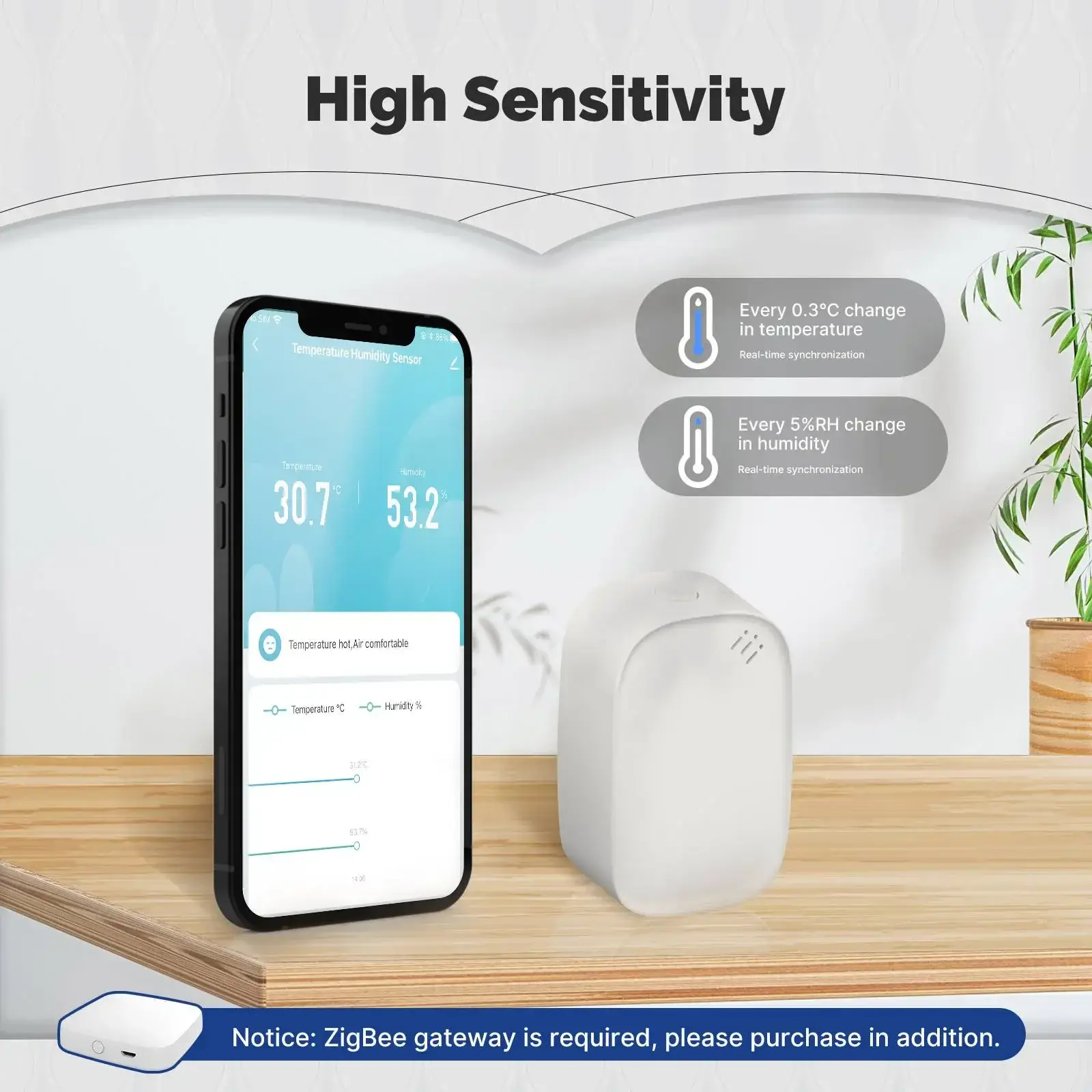 مستشعر ذكي لدرجة الحرارة والرطوبة يعمل بتقنية زيجبي، مزوّد بتطبيق لمراقبة القياسات الداخلية بسهولة.