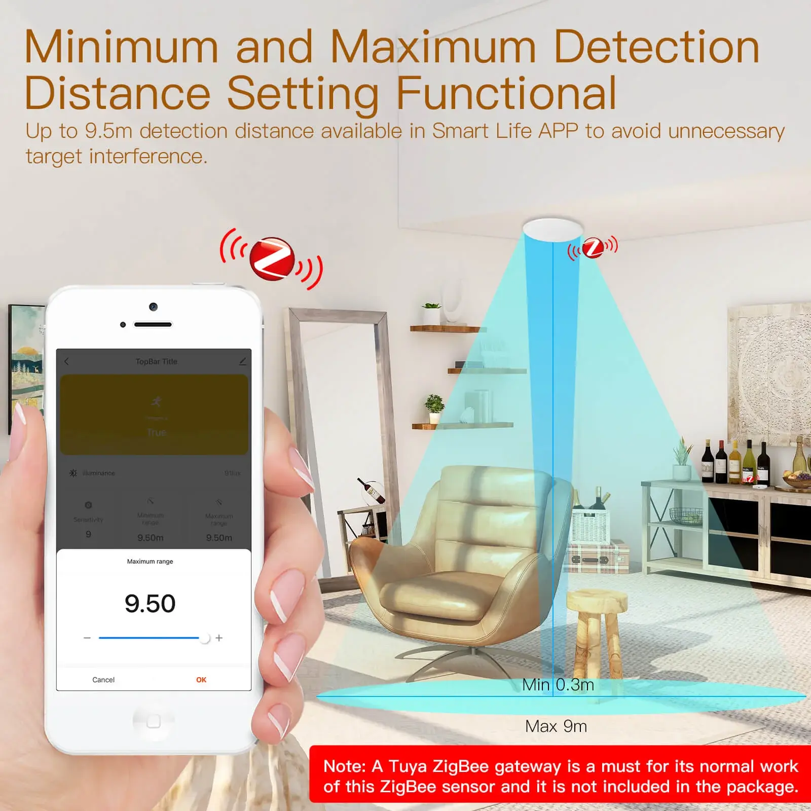 - مستشعر ذكي ثنائي البروتوكول ZigBee/WiFi: يوفّر كشف وجود الأشخاص، الحركة الدقيقة، وحتى الثبات مثل حالة النوم بدقة عالية بفضل تقنية الرادار الموجي mmWave.