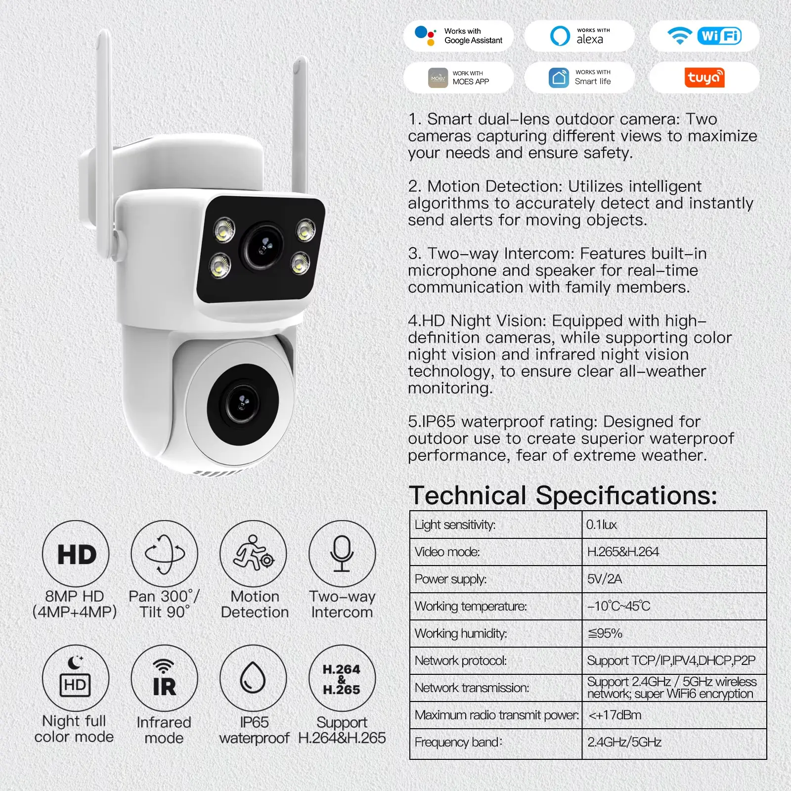 كاميرا مراقبة خارجية ذكية من Tuya بدقة 8 ميجابكسل – شاشة مزدوجة، مقاومة للماء بمعيار IP65، كشف للحركة، تتبع تلقائي، صوت ثنائي الاتجاه، تدعم WiFi 2.4G/5G