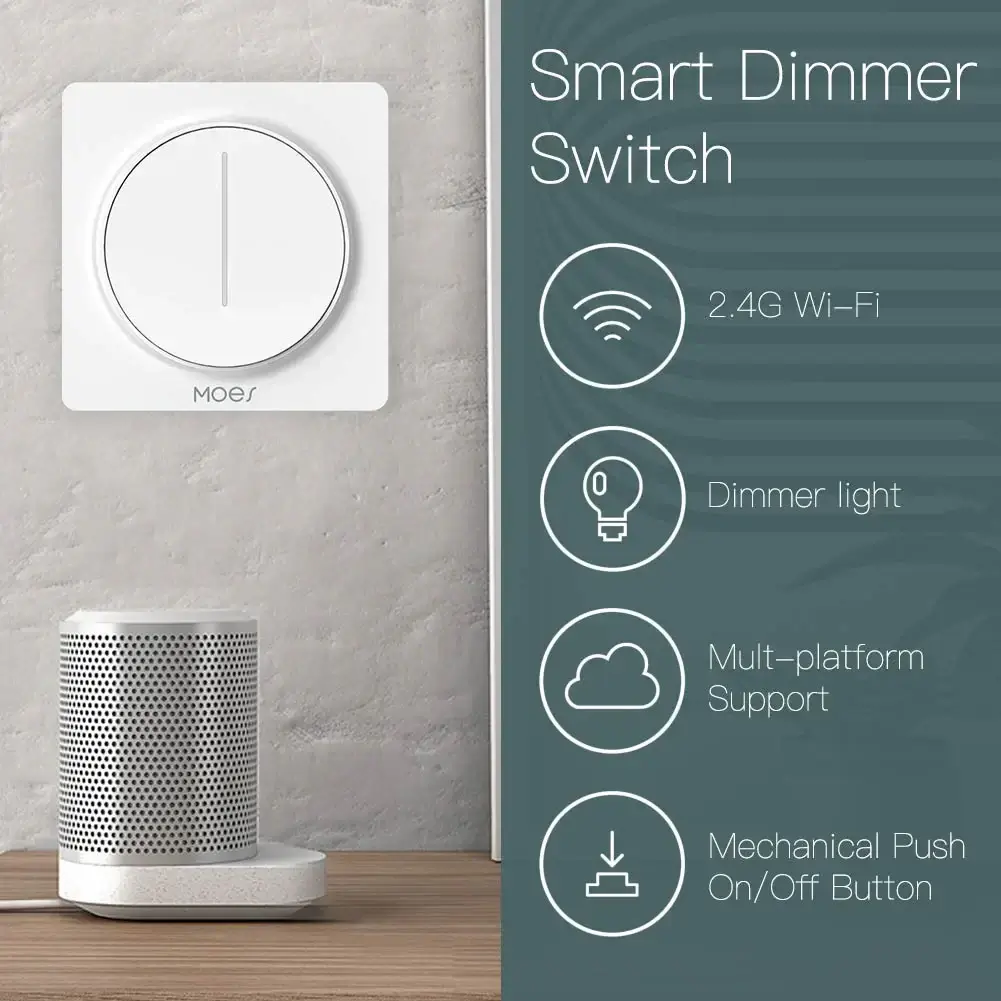 مفتاح لمس ذكي لتعتيم الإضاءة يعمل بالواي فاي، مزود بمؤقّت وجدولة، ذاكرة لمستوى السطوع، وتحكم عبر التطبيق. مثالي لتعتيم الإضاءة بسلاسة وأتمتة المنزل الذكي، بمعيار أوروبي.