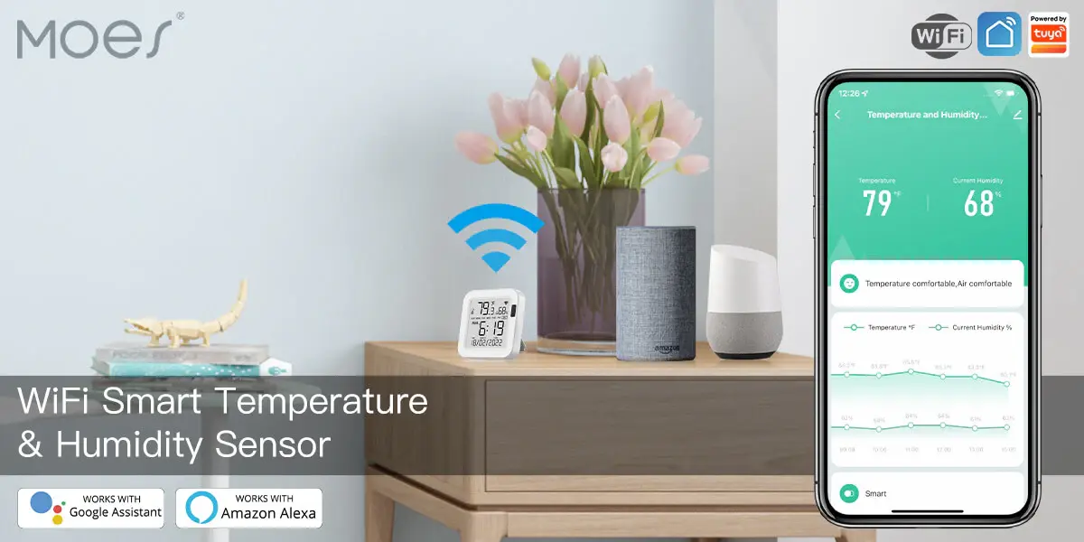 • يدعم الأوامر الصوتية: متوافق مع Alexa وGoogle Home للتحقق من حالة الحرارة والرطوبة عبر الأوامر الصوتية. يدعم مشاركة الجهاز مع أفراد العائلة وإعداد سريع عبر البلوتوث على شبكة Wi-Fi 2.4G.