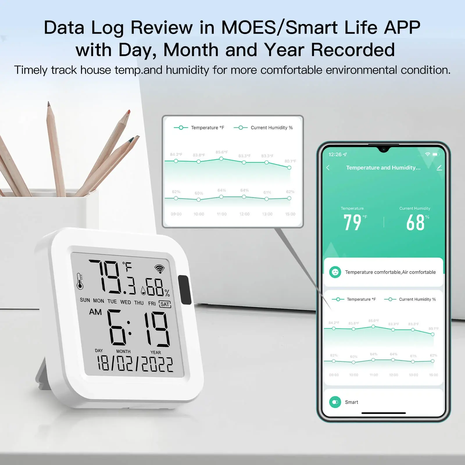 • متوافق مع تطبيق Tuya / MOES: راقب بيانات الحرارة والرطوبة بسهولة عبر تطبيق Tuya Smart على الهاتف دون الحاجة لهب، مع عرض رسوم بيانية يومية، شهرية وسنوية. مزوّد بوضع حماية خاص للأطفال عبر تعبيرات الوجه لتوفير أفضل بيئة لهم.