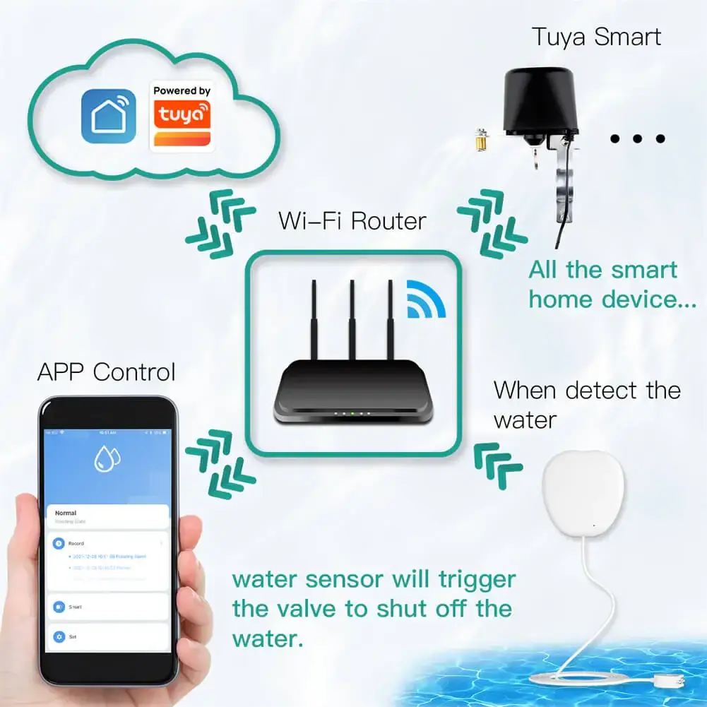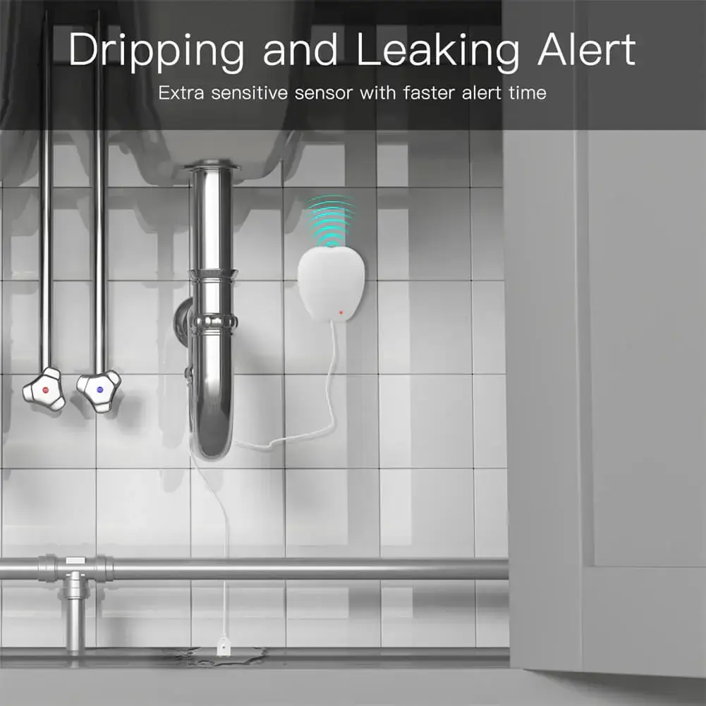 أتمتة المنزل الذكي مساعد مثالي لمنزلك الذكي! لن تقلق بعد الآن بشأن تسرب المياه بفضل الاستشعار عالي الحساسية الذي يحمي منزلك وممتلكاتك من التسربات المزعجة والفيضانات الخطرة، سواء كان الأمر يتعلق بصنبور يقطر أسفل خزانة الحمام، أو أنبوب مكسور في القبو، أو حتى حالة طقس شديدة. يمكنك ربط هذا المستشعر الذكي بصمامات المياه الذكية لديك ليعمل تلقائيًا، فعند اكتشاف أي تسرب، سيقوم المستشعر بإغلاق الصمام بشكل آلي.
