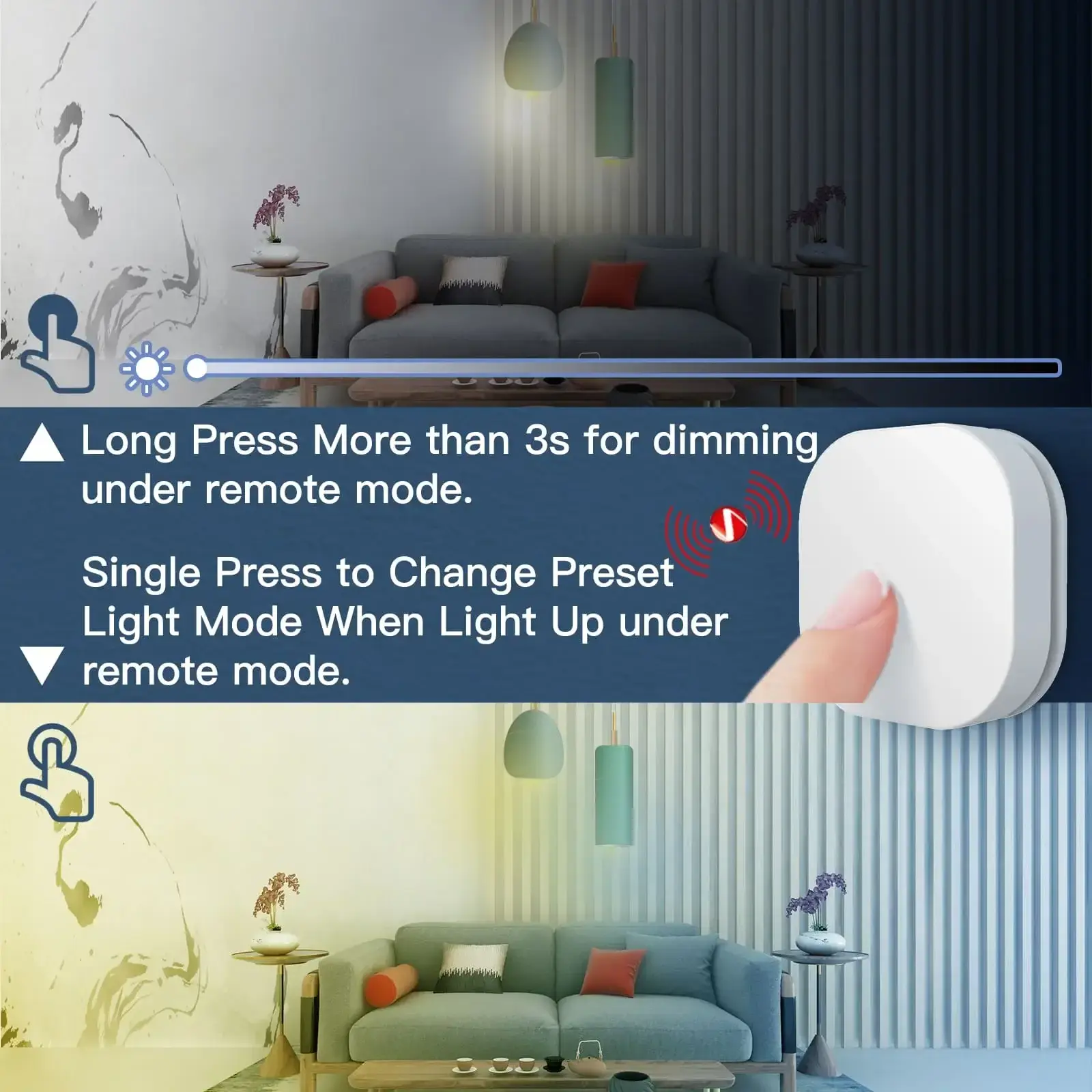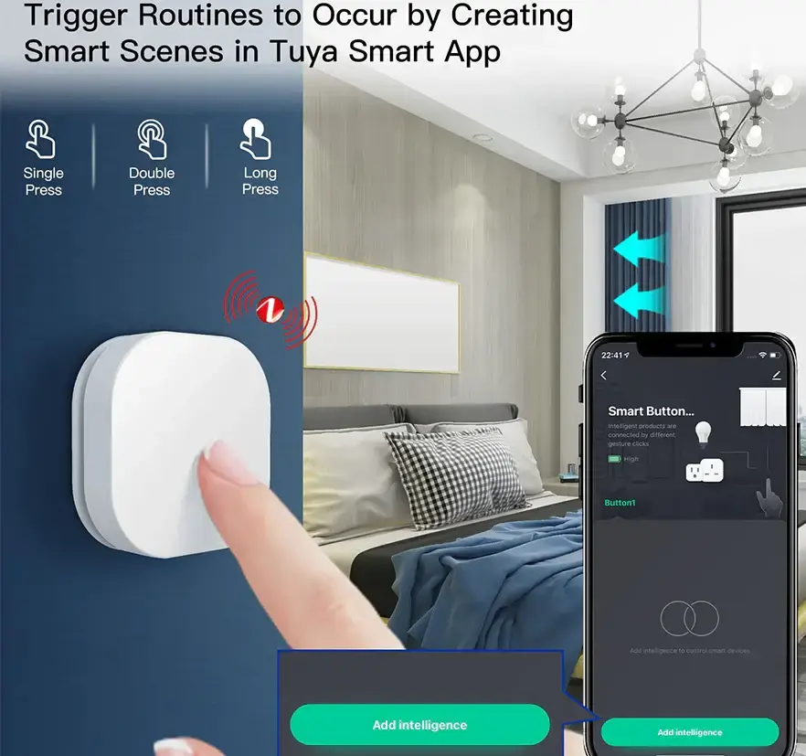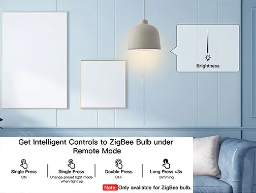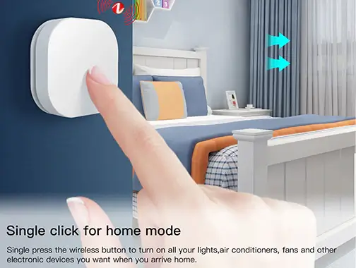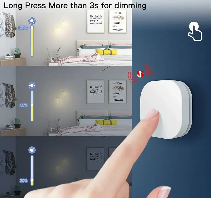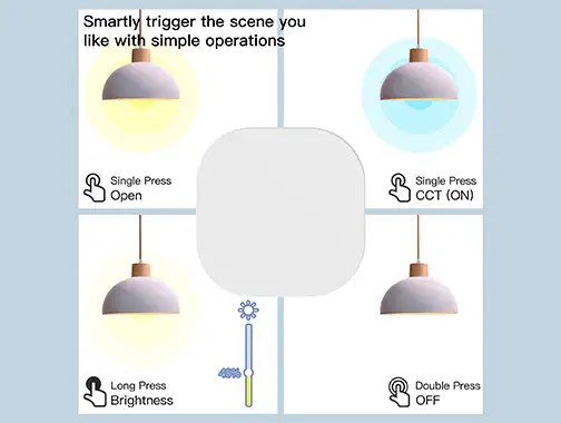 قم بتفعيل المشهد المفضل لديك بسهولة بضغطة واحدة فقط. اضغط مطولاً (أكثر من 3 ثوانٍ) للتحكم في مستوى الإضاءة وضبط السطوع حسب الحاجة. الحجم الصغير يسمح باستخدامه في أي مكان—ثبته على الحائط، ضعه على الطاولة، أو احمله معك. اندمج بسهولة مع أي غرفة أو بيئة لتعزيز تجربة منزلك الذكي بتحكم بديهي وخيارات تثبيت متعددة.