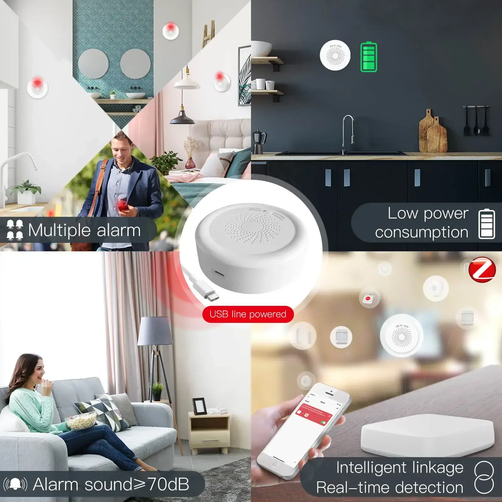- تركيب سهل واستهلاك منخفض للطاقة: يعمل الجهاز عبر شحن USB، ويمكن تركيبه على الحائط أو السقف بسهولة. يناسب أنظمة الحماية من الحرائق التقليدية ويعمل كجهاز أمان شامل للمنزل، إذ يوفّر إنذارات حية بالصوت والضوء للحماية من تسرّب الغاز."