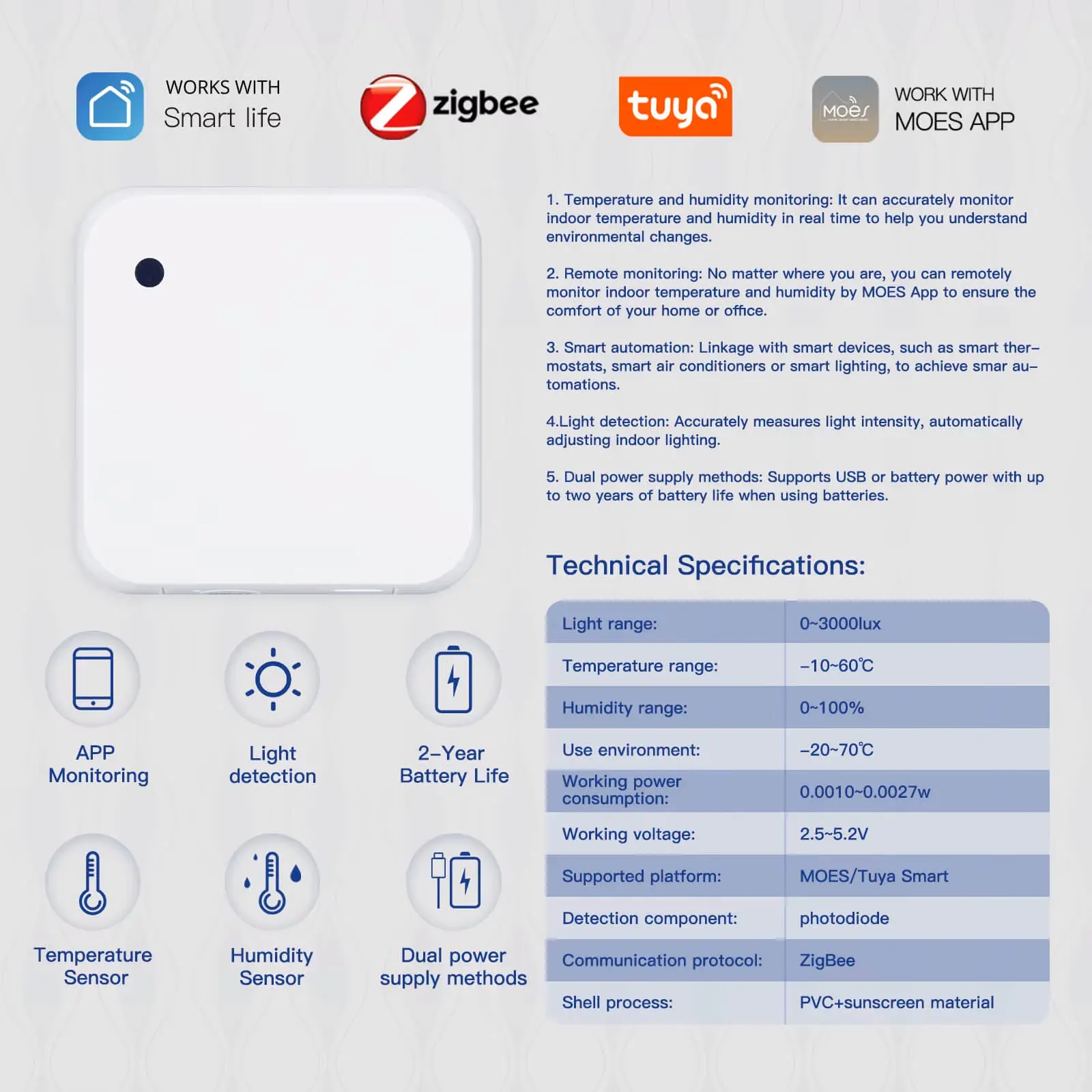 - الوصف: مستشعر ذكي لدرجة الحرارة والرطوبة وشدة الإضاءة ZigBee