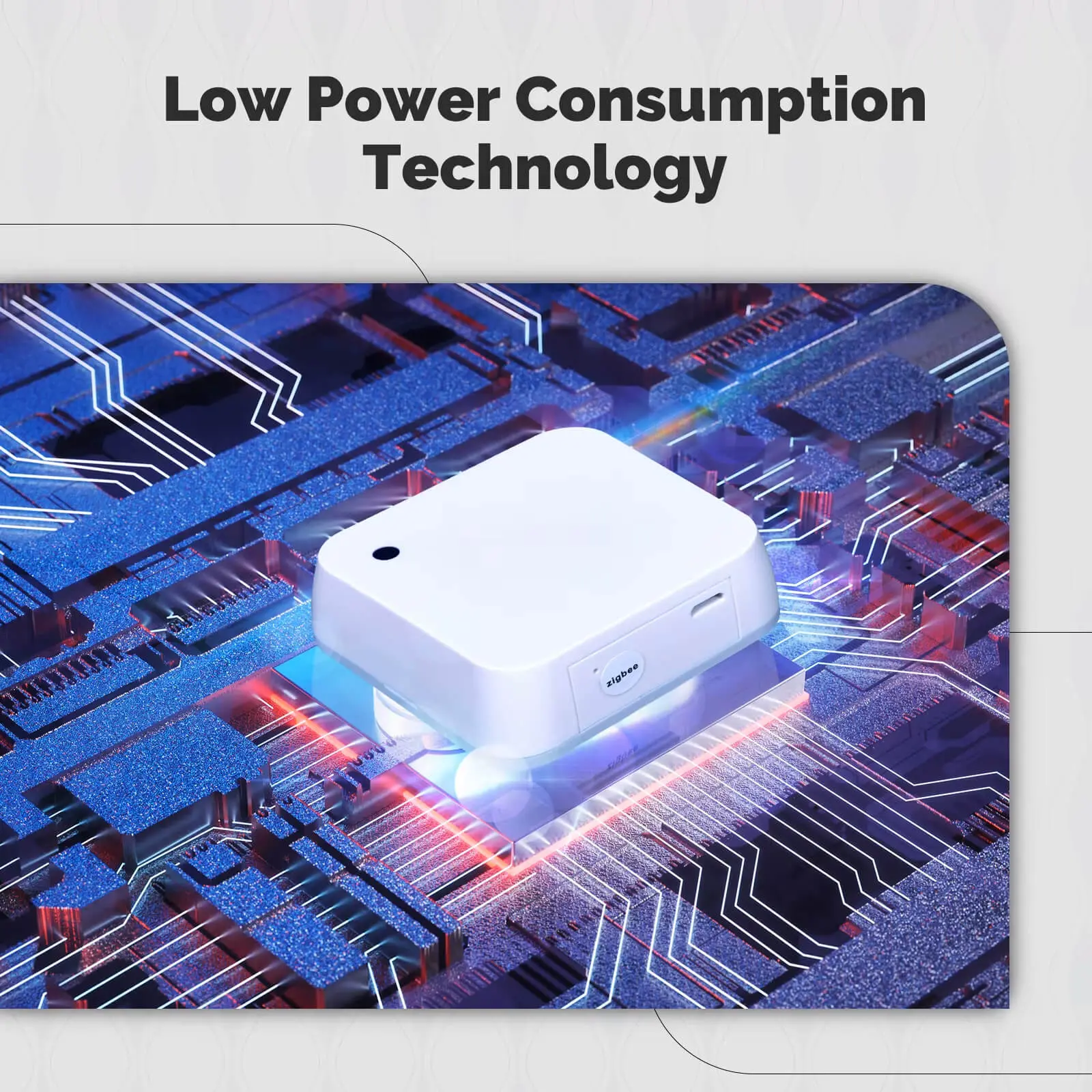 - تقنية استهلاك طاقة منخفضة: يعتمد على تقنية ZigBee منخفضة الاستهلاك للطاقة ويقوم بالإبلاغ كل ثلاث دقائق لتقليل استهلاك البطارية، مع إمكانية الحصول على البيانات الفورية عند الحاجة من خلال الضغط القصير على زر إعادة الضبط.