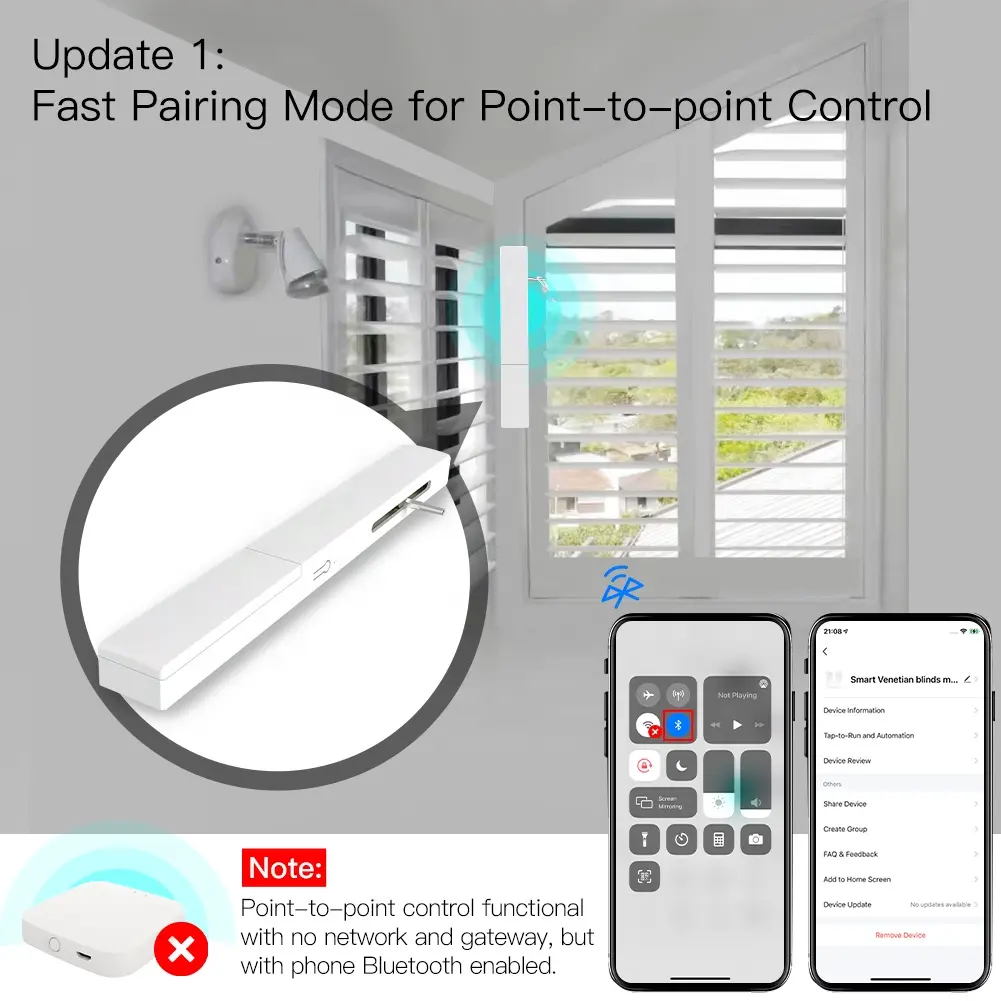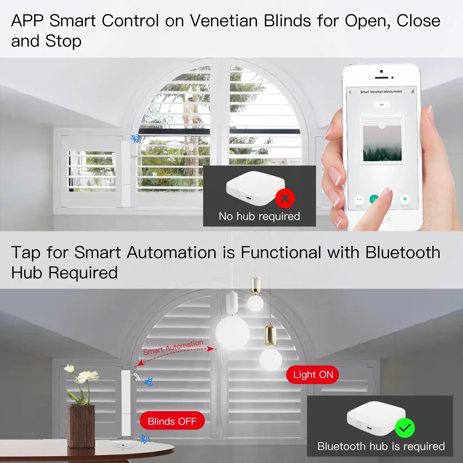 - 1. Single point-to-point control to connected devices in Smart Life App, no gateway and no network required, only a mobile phone with Blue tooth on is required for controlling with no delay,a really great necessity for your house Venetian blinds motor.Extremely simple and fast pairing method is featured for added convenience.(Note:It is only designed for plantation shutters Venetian blinds,not for all roller blinds.)