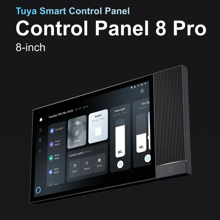 Smart 8-inch HD touch screen panel with built-in Alexa for voice control, one-touch device and scene control, integrated ZigBee gateway and BLE Mesh, plus IR control for easy smart home management.