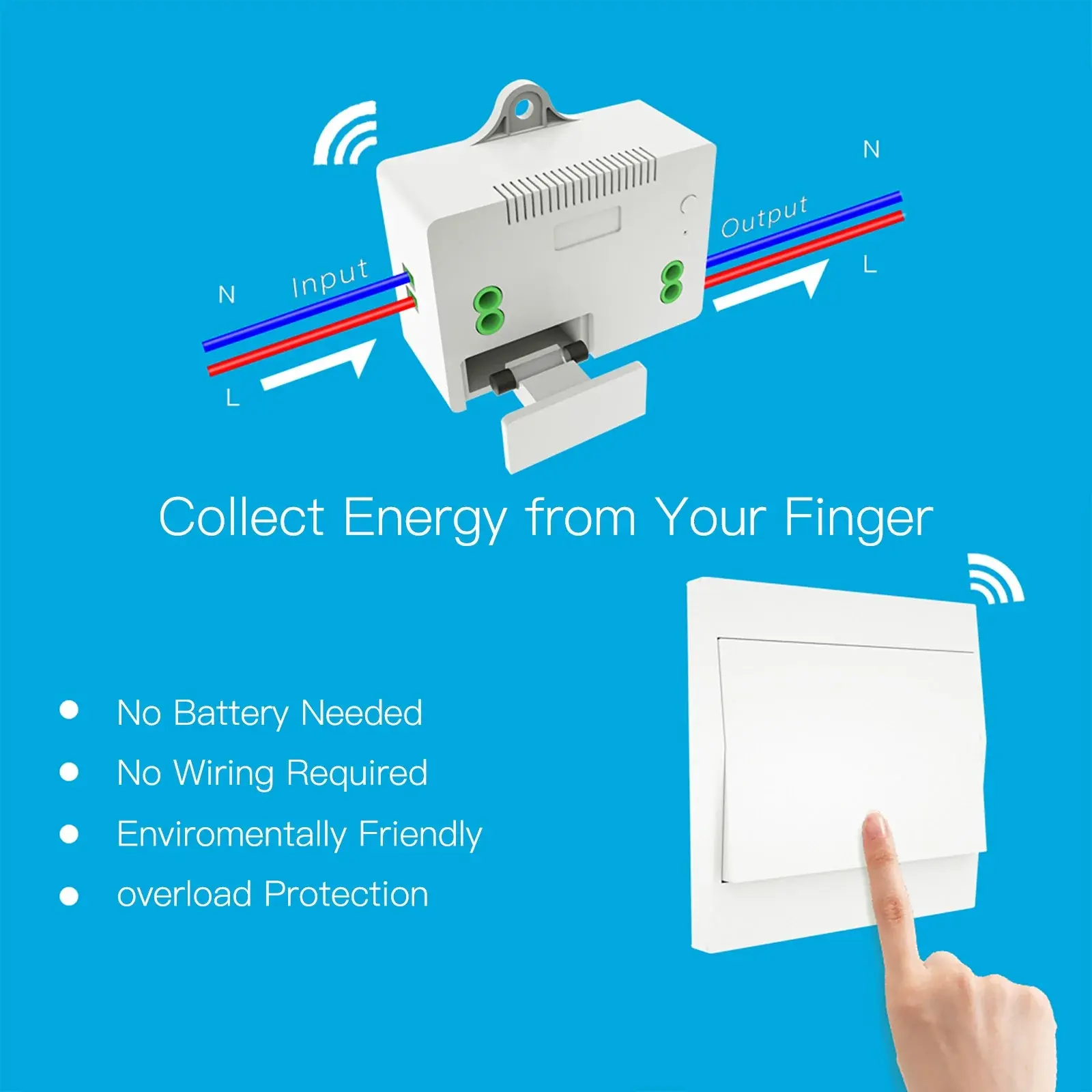 - No Wi-Fi/Battery to Control:With the self power generation feature of the Wall Panel Remote Transmitter Switch,you are able to remotely control the devices connected to the RF433 Relay Receivers without WiFi or battery,as long as match the switch to the receiver in advance.Also,the rocker push button enables a lot convenience to your smart life.