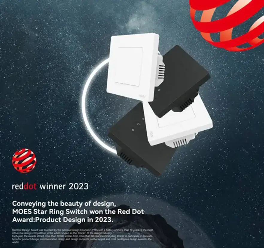 The MOES Star Ring Switch was honored with the prestigious Red Dot Award for Product Design in 2023. This globally recognized award, running for over 60 years with entries from more than 60 countries, celebrates excellence in design. The MOES Star Ring Switch combines style and functionality, making it a standout choice for any smart home.