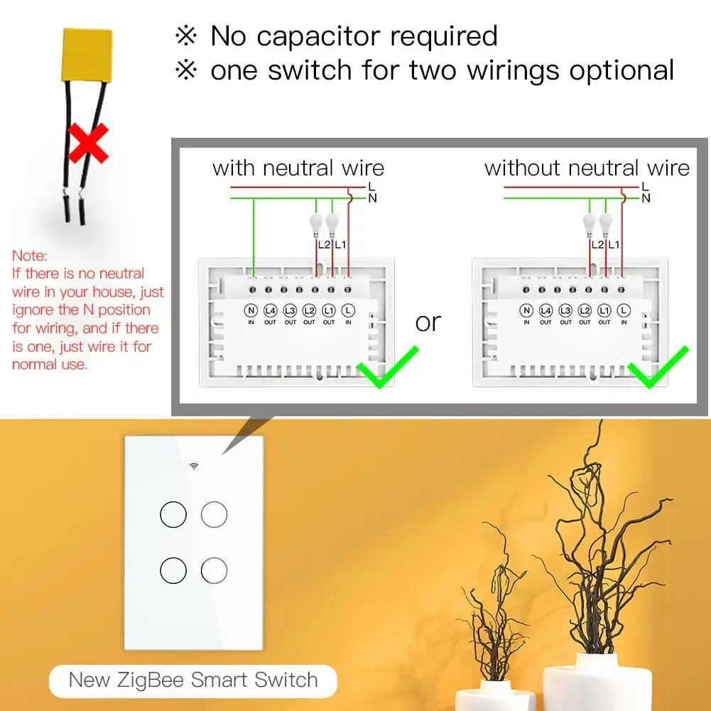 Control your lights smartly with ZigBee Touch Switch: multi-control pairing, neutral wire optional, no capacitor needed, app & voice control, and seamless smart home integration (US standard).