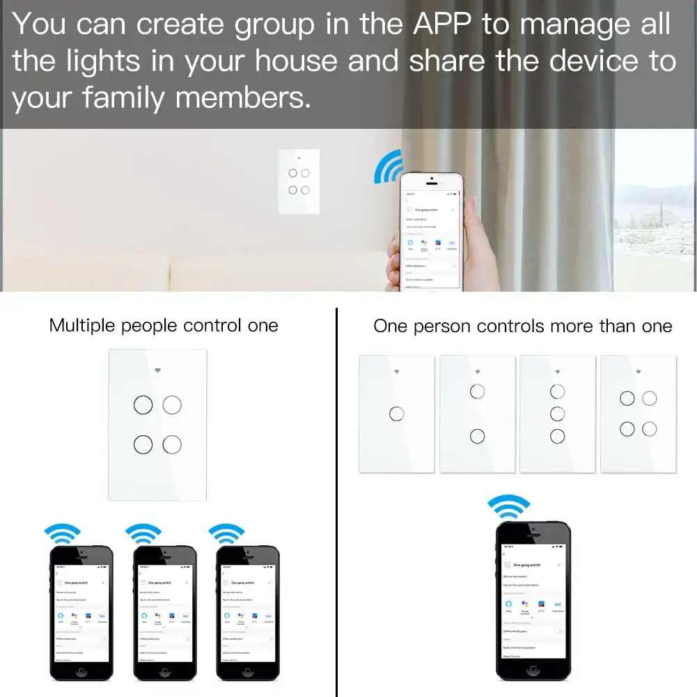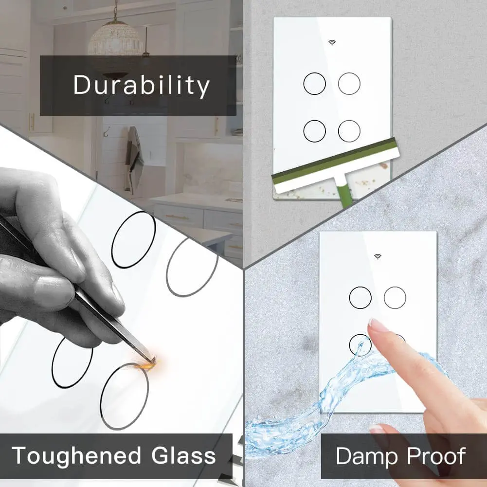 • Elegant Design & Optional Backlight: Premium design with a toughened glass surface resists scratches and is damp-proof for humid environments. Turn the backlight on or off and configure relay status (remember last status after power off) via the app for better sleep. Capacitive touch allows single-touch on/off control, and the scratch-resistant glass blends seamlessly with any wall décor.