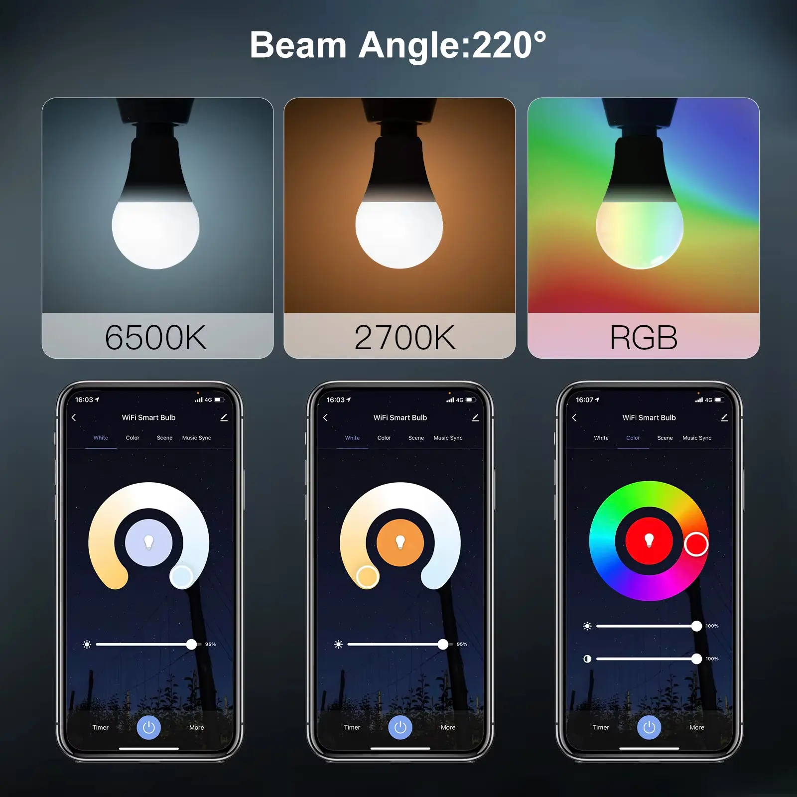 1. Hands-free Voice Control: Our smart ledlight bulb is compatible with Amazon Alexa and Google Assistant for easy voice control. Just control it via your voice command to turn on/off or dim/brighten your light, even switch your light to specific color as you need and music lighting effected by surrounding sounds to cater for different color scenes.No hub required and easy to install. NOTE: WiFi smart led light bulb only supports 2.4 GHz Wi-Fi network with 110/220V voltage featured.