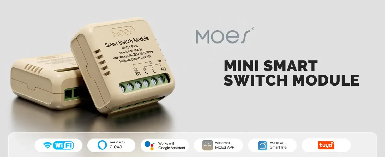 Mini WiFi smart switch module with relay timer, supports 1 or 2 gang control. Easily control your lights via mobile app or voice assistants for a smart home experience.
