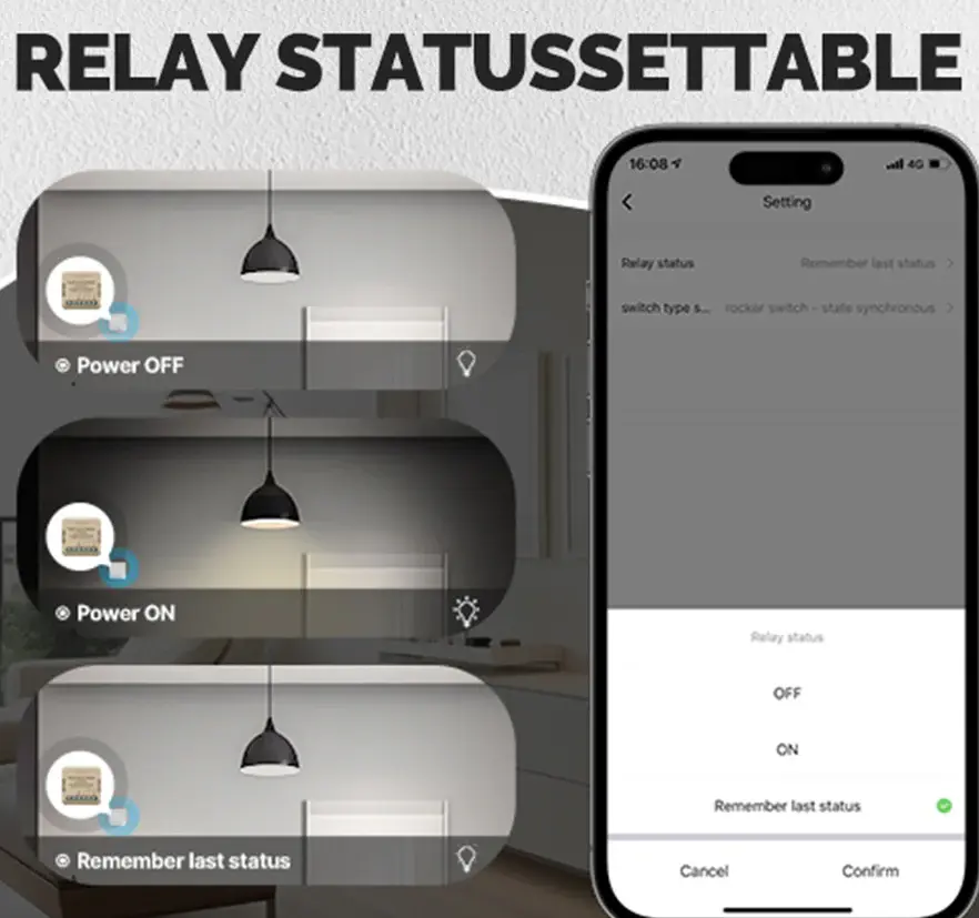 - RELAY STATUS SETTABLE: According to your living habits and needs, set the device on/off after the power on or maintain the original switch state, so that your home equipment can operate normally.