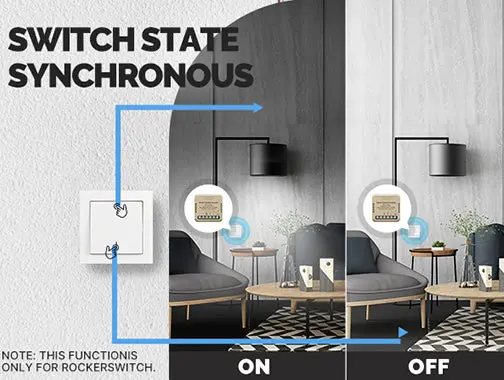 - SWITCH STATE SYNCHRONOUS: Supporting the double control of two matched roker switches. Two operation types of flip to change on/off state and state synchronous can be set. After setting state synchronous, the on/off position is fixed and synchrounous with each switch.