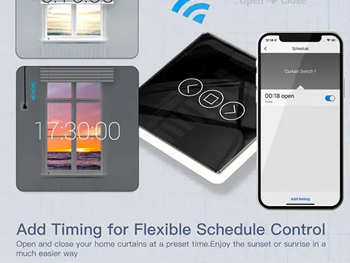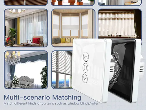 Experience seamless style and functionality with our Arc Glass switch. Effortlessly control roller blinds from anywhere with WiFi connectivity and the MOES app. Featuring a new upgraded 2.5D arc glass touch panel design, it supports manual, app, RF remote, and voice control. Pair with various window treatments and set flexible schedules for ultimate convenience.