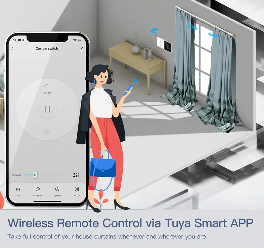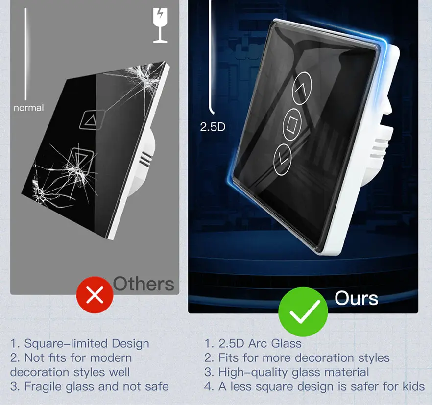 - Arc Glass Design: Elevate home aesthetics with a sleek 2.5D arc glass touch panel. Effortlessly control window treatments.