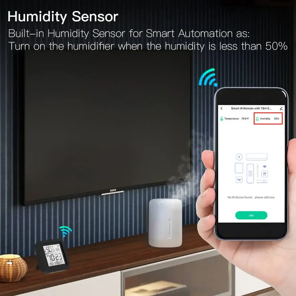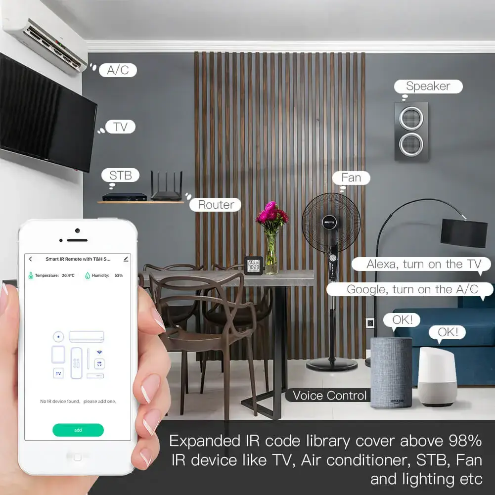 Monitor and control your AC & TV via WiFi with built-in temperature & humidity sensing — voice commands & app automation.