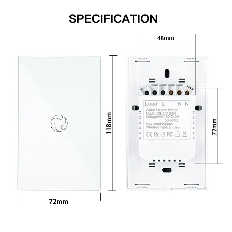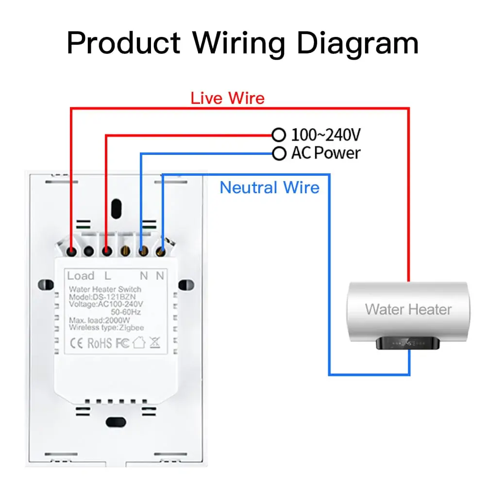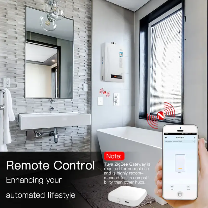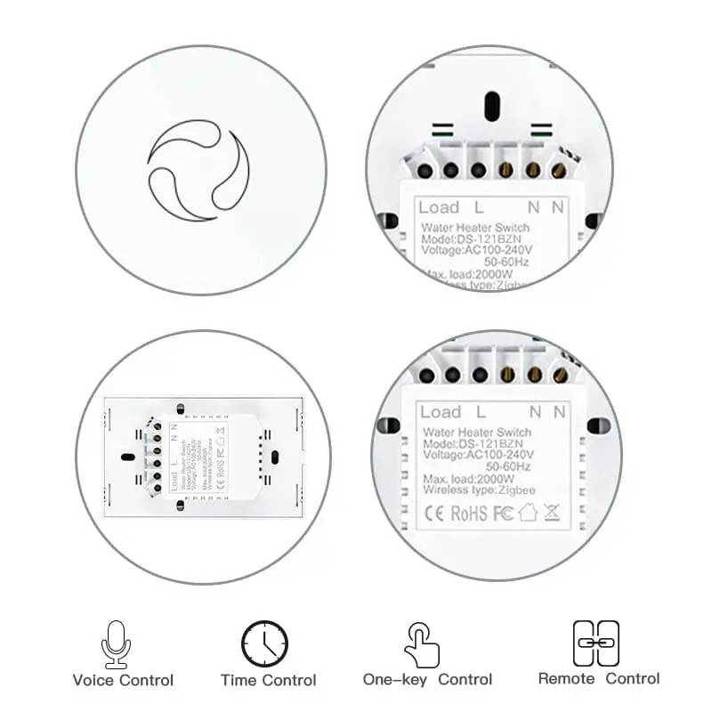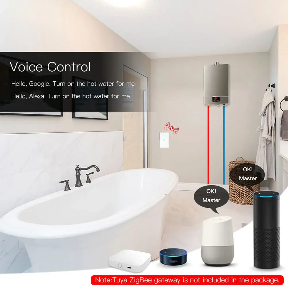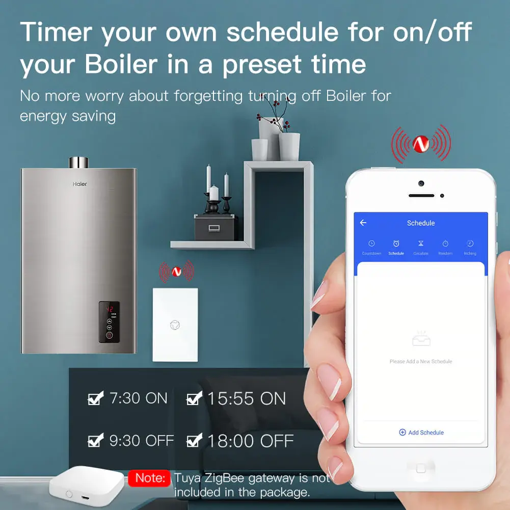 ZigBee smart boiler touch switch for water heaters, single pole design, neutral wire required, US standard 20A/40A. Safe, precise, and convenient smart home water heating control.