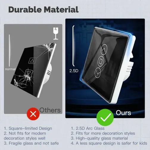 - Touch Control: Featuring a sensitive touch experience with 2.5D arc glass design, control the curtains with just a tap.