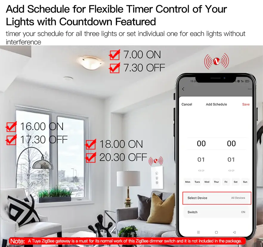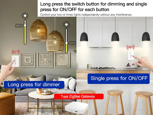 - Tuya MOES ZigBee Gateway Required: To enable wireless remote control of the smart dimmer switch, a Tuya MOES ZigBee gateway is required.
