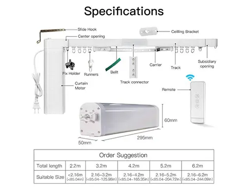 Introducing the ZigBee Smart Electric Motorized Splicing Curtain Tracks System, a revolutionary electric curtain system that brings convenience and style to your home. With our Tuya Curtain Motor and DIY Track RF Remote, you can effortlessly control your curtains with just a touch of a button. Our PYM21A-type curtain system is designed to make your life easier. It operates on a rated voltage of AC100-240V 50/60Hz with a low-rated current of 0.3A, ensuring energy efficiency and safety. The motor speed of 90rpm allows for smooth and quiet operation, while the maximum load capacity of 50 ensures that it can handle even the heaviest curtains. In the package, you will find all the necessary components for installation, including two master gearboxes, two pulleys, and seven runners per bag (with additional bags included for longer tracks). The track connecting brackets are included as well, with one bracket per meter for easy installation on either the ceiling or wall. To ensure seamless operation, we provide you with a belt roll and plug for easy connectivity. And don't worry about controlling your curtains - our RF433 Hand remote is included in the package, allowing you to adjust your curtains from anywhere in your home. Upgrade your home with our ZigBee Smart Electric Motorized Splicing Curtain Tracks System today and experience the ultimate convenience in electric curtain systems.