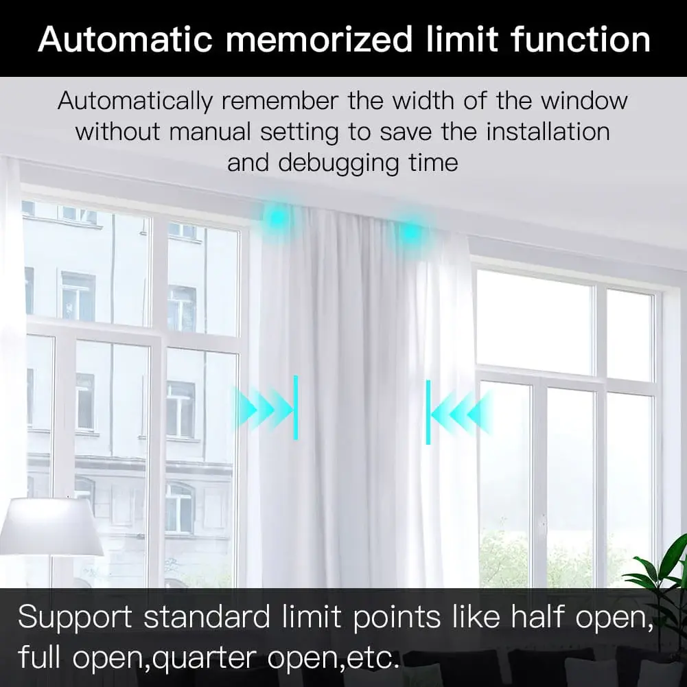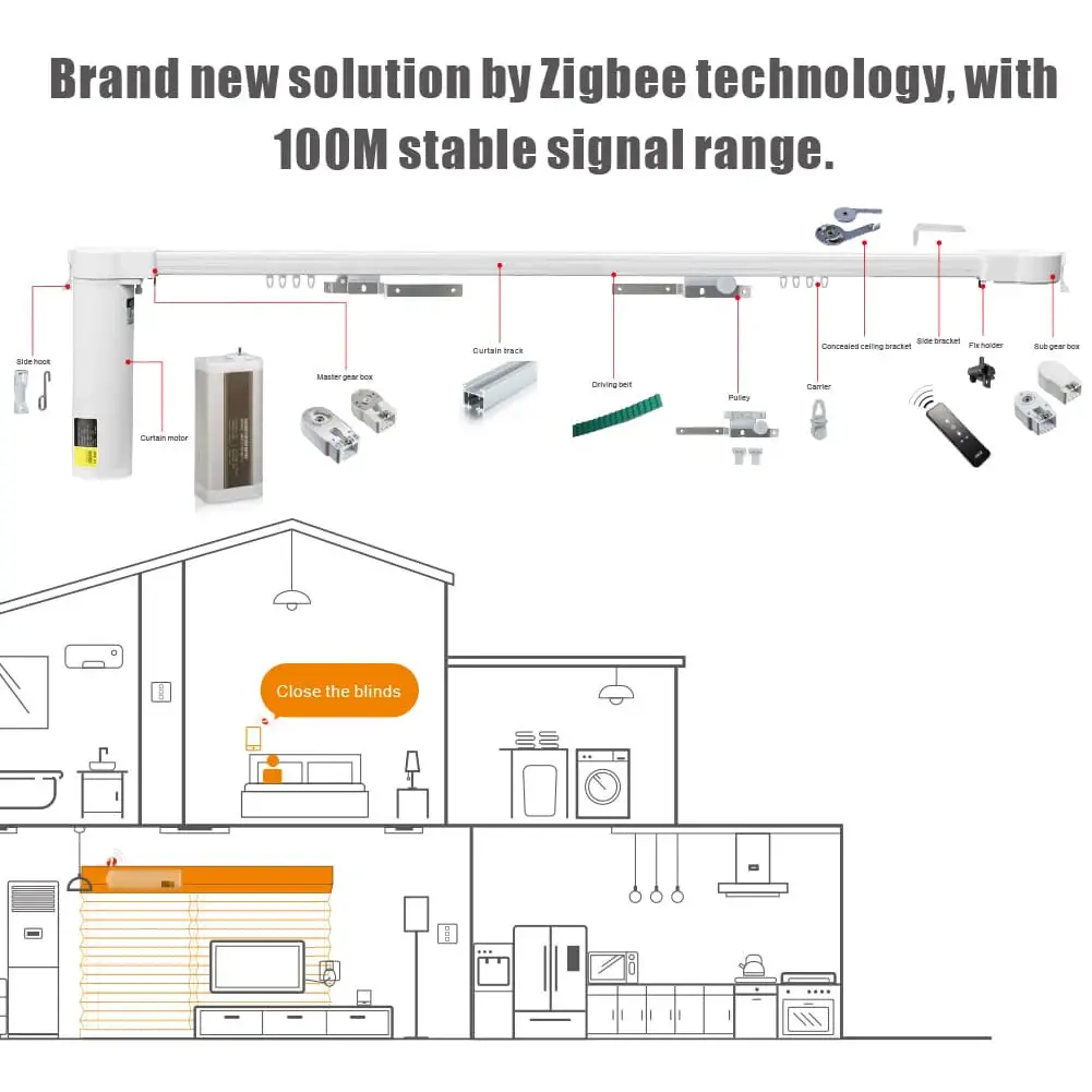 Please note that a ZigBee Hub is required for normal use of the curtain motor track. This ensures a seamless and reliable connection. With brand-new Zigbee technology, this system offers a stable signal range of up to 100M, ensuring smooth operation every time. Plus, the automatic memorized limit function saves you time during installation and debugging by automatically remembering the width of the window without manual setting. Additionally, this system supports standard limit points such as half open, full open, quarter open, and more. It's never been easier to achieve the perfect amount of natural light and privacy in your space. Upgrade your curtains and transform your home with the ZigBee Smart Electric Motorized Splicing Curtain Tracks System now!