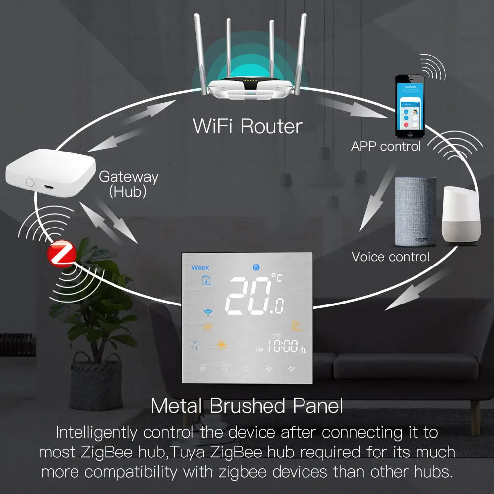 - Functional Water Heating with ZigBee Hub Required: Control with ZigBee protocol included for intelligent water heating,provide maximum and comprehensive convenience to your smart life.Tuya ZigBee hub is required for normal use and bridge network center for all ZigBee devices for whole house linkage featured as much more compatibility with our ZigBee thermostat than any other ZigBee hubs. (Note: current load is 5A for water floor and gas boiler system,16A for electric floor heating.)